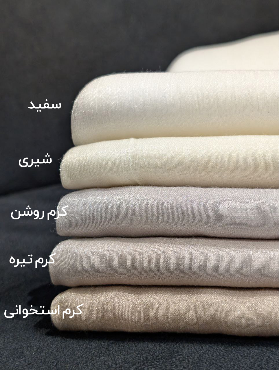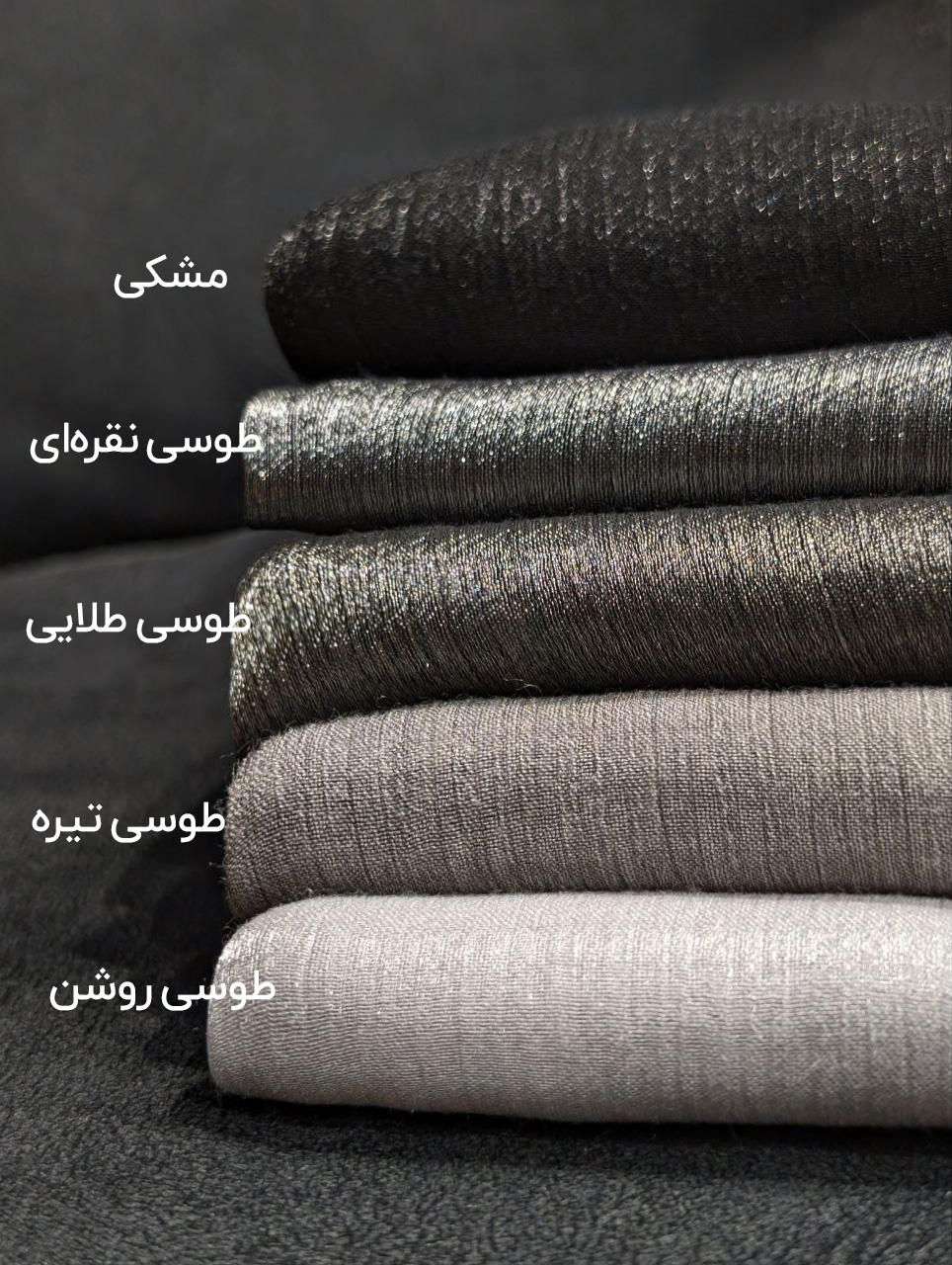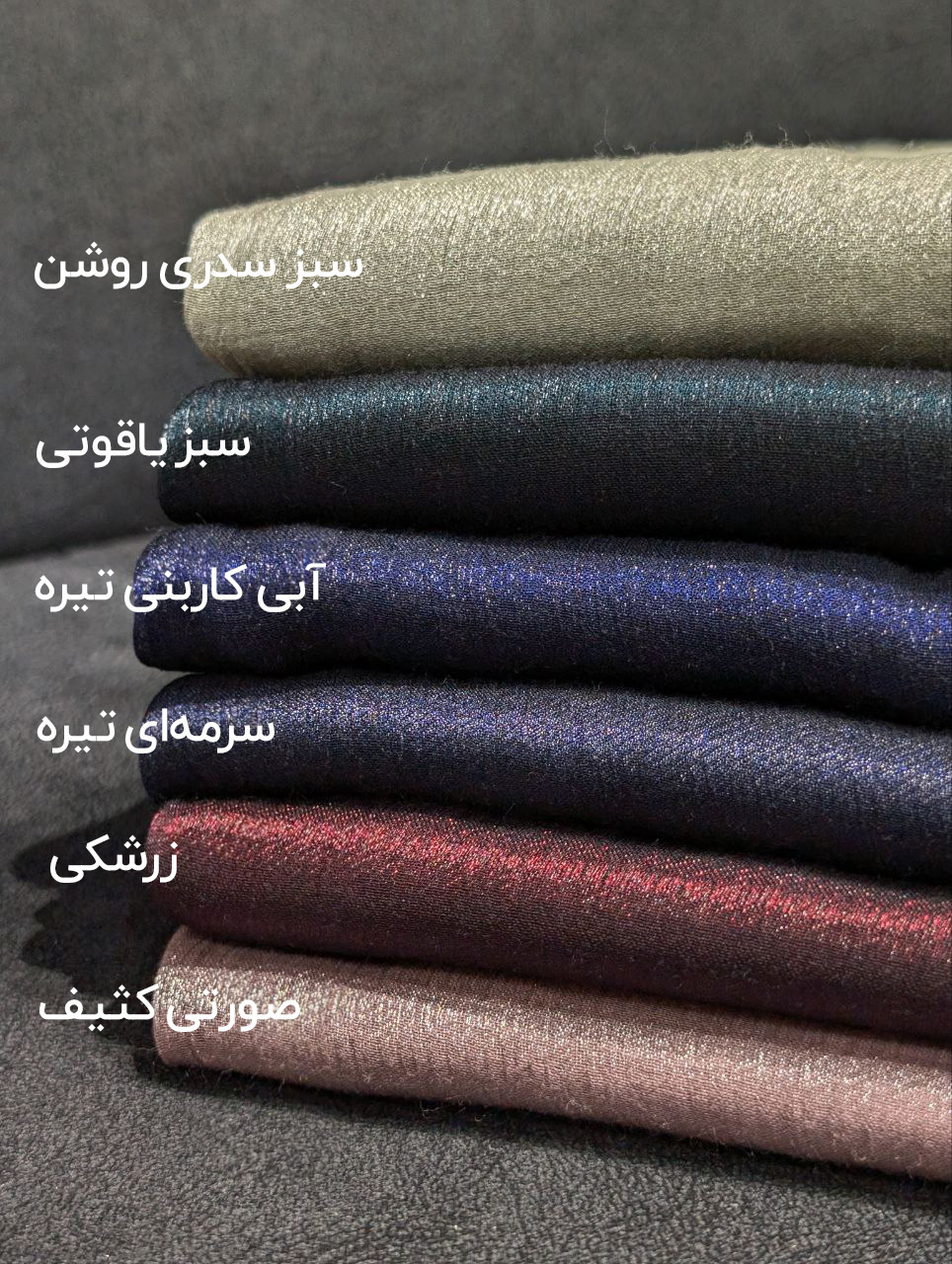 | رنگ | سبز, سبز روشن, سبز تیره, سرمه ای, سرمه ای روشن, سرمه ای تیره, طوسی, طوسی روشن, طوسی تیره, سبزآبی روشن, سبزآبی تیره, سبزآبی, قهوه ای روشن, قهوه ای تیره, قهوه ای, بژ, دودی, کرم, کرم روشن, کرم تیره, نقره ای, نقرابی, سرخابی, بنفش نقره ای, بنفش طلایی, آبی, آبی روشن, آبی تیره, آبی آسمانی, آبی فیروزه ای, آبی کاربنی, آبی کاربنی روشن, آبی کاربنی تیره, آبی نیلی, آبی نفتی, قرمز, قرمز روشن, قرمز تیره, قرمز کوجه ای, جگری, زرشکی, عنابی, مشکی, مشکی نقره ای, قهوه ای-کرم, صورتی کثیف, نباتی, کرم استخونی, کرم نخودی, شیری, خاکی روشن, خاکی تیره, نسکافه ای, شکلاتی, یاسی, سبز مغز پسته ای, سبز یشمی, سبز لجنی, سبز لجنی روشن, سبز ارتشی, سبز زیتونی, سبز دریایی, عنابی-زرشکی, دودی-خاکی, سرمه ای-خاکی, صدری-خردلی, قهوه ای روشن-قهوه ای تیره, آجری تیره-روشن, خردلی, خردلی تیره, خردلی روشن, نارنجی, نارنجی روشن, نارنجی تیره, خاکی, نسکافه ای روشن, نسکافه ای تیره, بنفش, بنفش روشن, بنفش تیره, کرم شتری, آبی جین, شرابی, شرابی روشن, شرابی تیره, سبز صدری, پوست پیازی, گلبهی, آجری, کالباسی, یاسی تیره, سماقی, سبز صدری روشن, سبز صدری تیره, نارنجی گلبهی, خاکستری, زرد, لیمویی, طلایی, سفید, ارغوانی, صورتی, صورتی روشن, صورتی تیره, دلفینی, 1کرم طوسی, 2-کرم نسکافه ای, 2-کرم خاکستری, کله غازی, 2-لجنی تیره روشن, 2-خاکستری تیره روشن, 2-کله غازی تیره روشن, 2-سفید استخونی طوسی, 2-سرخابی ارغوانی, 2-ارغوانی تیره روشن, 2- طوسی خاکستری, 2-خاکی تیره روشن, 2-دودی نوک مدادی, 2-قرمز تیره روشن, 2-شتری تیره روشن, 2-کاراملی خاکی, استخوانی, سبز سرخابی, 1سبز کرم, طوسی صورتی, 2-کرم گلبهی, 2-طوسی لیمویی, طوسی کرم, 2-مشکی طلایی, 2-سفید طلایی, 2-مشکی کرم, 2-کرم طلایی, 2-سرمه ای کرم, 2-یاسی کرم, 2-کرم خاکی بژ, 2-سفید کرم, 2-سرمه ای طلایی, 2-مشکی قرمز, 2-قهوه ای کرم, طوسی ملانژ, زرد تیره, طوسی ملانژ تیره, سبز طالبی, سبز یاقوتی, نوک مدادی, صورتی عروسکی, سبز بنتون, ارغوانی روشن, سبز طوسی, 1نارنجی سبز, 1طوسی مشکی, 1کرم نارنجی, 1سبز سرمه ای, 1کرم تیره روشن, 1سبز سبز, 1آبی سرخابی, 1مشکی کرم, 1آبی آبی, 1مشکی سبز, 1نارنجی کرم, بژ تیره, مشکی طلایی, رزگلد, 1سفید کرم, 1آبی روشن کرم, 1سرمه ای کرم, 1کرم روشن نسکافه ای, 1صورتی طوسی, 1نسکافه ای شیری طلایی, 1صورتی شیری نسکافه ای, 1قرمز کرم طلایی, 1شیری مشکی طلایی, 1مشکی کرم طلایی, 1مشکی شیری کرم, 1کرم مشکی طلایی, 1آبی صورتی, 1مشکی طلایی, 1سرخ آبی نارنجی, 1صورتی کرم, 1طوسی طلایی, ماشی, 1کرم خردلی, 1مشکی نارنجی, دونه اناری, آلبالویی, گلبهی کرم, مسی, سبز چمنی, کاراملی, 1مشکی سفید, عسلی, سفید مشکی, سبز کله غازی روشن, سبز کله غازی تیره, سبز کله غازی, مشکی سبز, مشکی سرخابی, سفید سبز, سفید نارنجی, سفید قرمز, کرم و صورتی, سبز و آبی, سبز و کرم, کرم و خردلی, سبزآبی و کرم, سفید و سرخابی, سفید و گلبهی, بادمجانی, ارغوانی تیره, کرم طلایی, فیلی, مشکی کرم, مشکی سفید, زرشکی روشن, زرشکی تیره, کالباسی تیره, سبز دریایی روشن, سبز آبی تیره, سبز دریایی تیره, سبز سدری, سبز سدری روشن, سبز سدری تیره, ذغالی, آجری روشن, آجری تیره, مشکی قرمز, کرم آبی, کرم سبز, سفید آبی, کرم سرمه ای, سفید سرمه ای, مرجانی, کرم و قهوه ای, خاکی تیره و قرمز, خاکی تیره و سرمه ای, خاکی روشن و خردلی, خاکی روشن و شکلاتی, آبی درباری, 1, 2, 3, 4, 5, 6, 7, 8, 9, 10, 11, 12, 13, 14, 15, 16, 17, 18, 19, 20, 21, 22, 23, 24, 25, 26, 27, 28, 29, 30, مشکی بژ, کرم مشکی, سبز ماچا, طوسی نقره ای, طوسی طلایی |