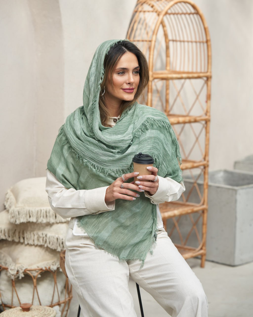 این شال نخی و سبک و دارای خط‌های در طول شال است.