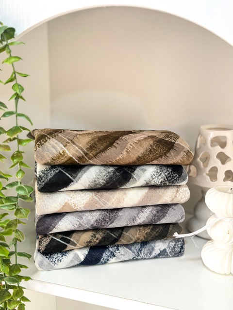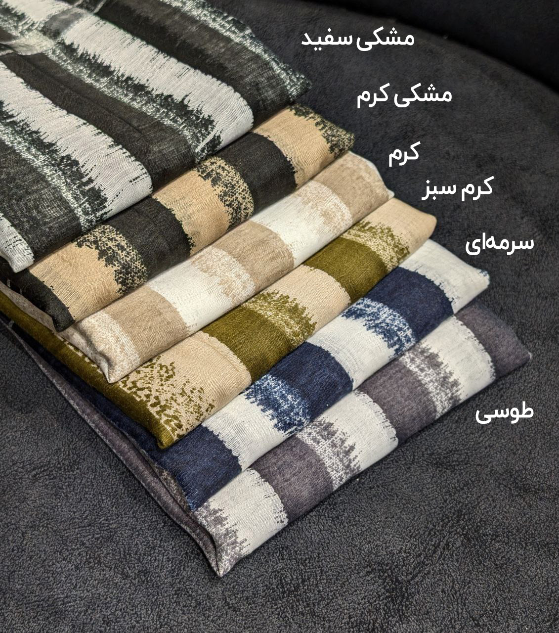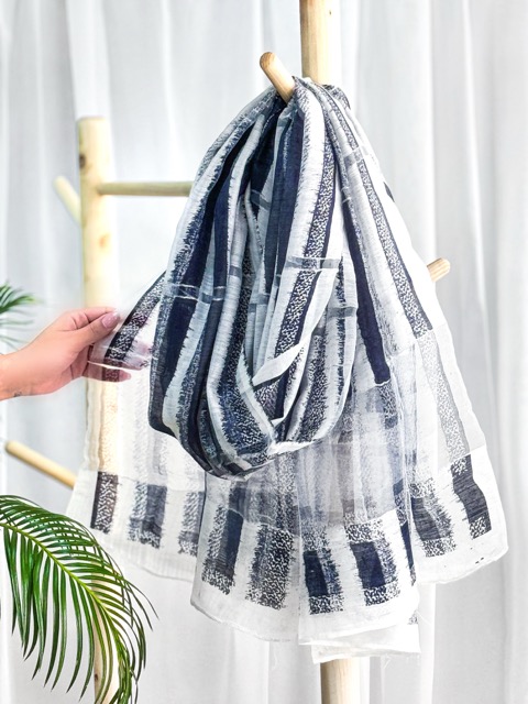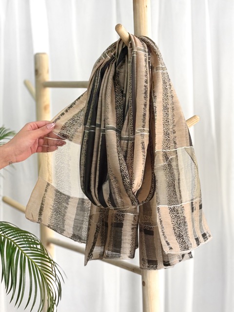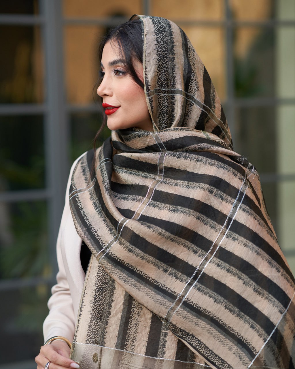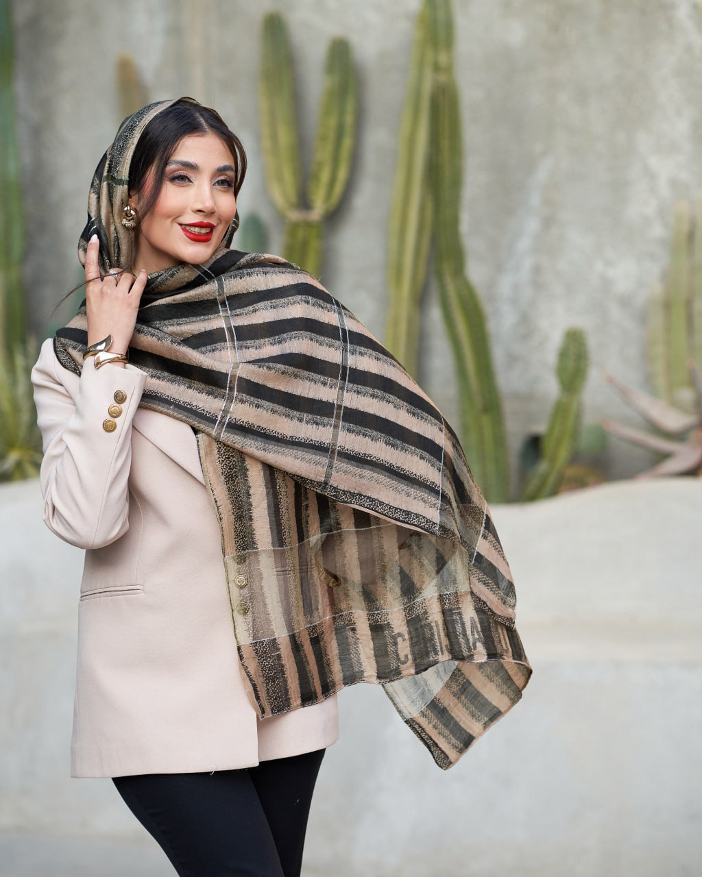 این شال سبک دارای خط‌های لمه‌دار در عرض آن است.